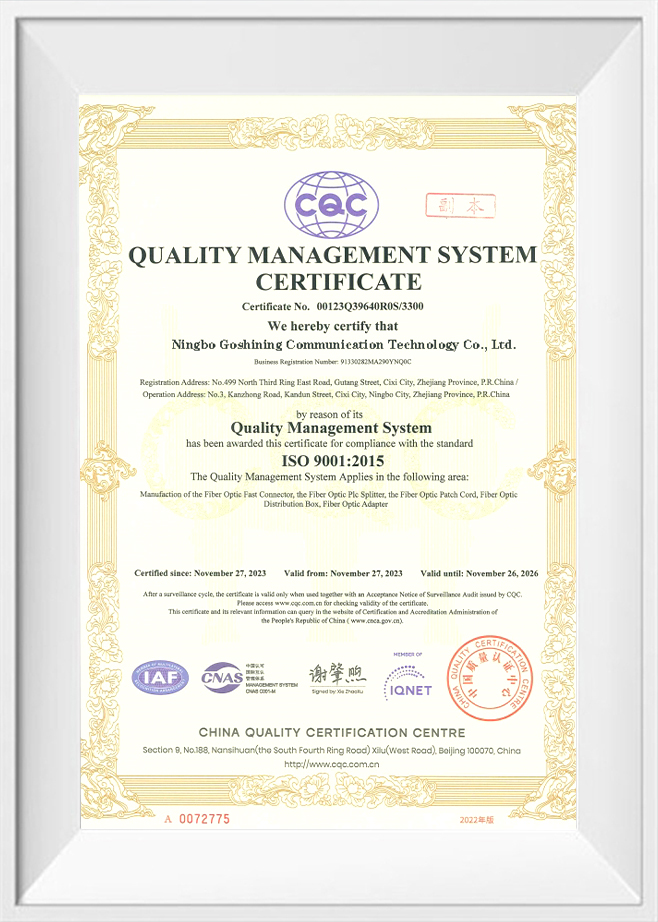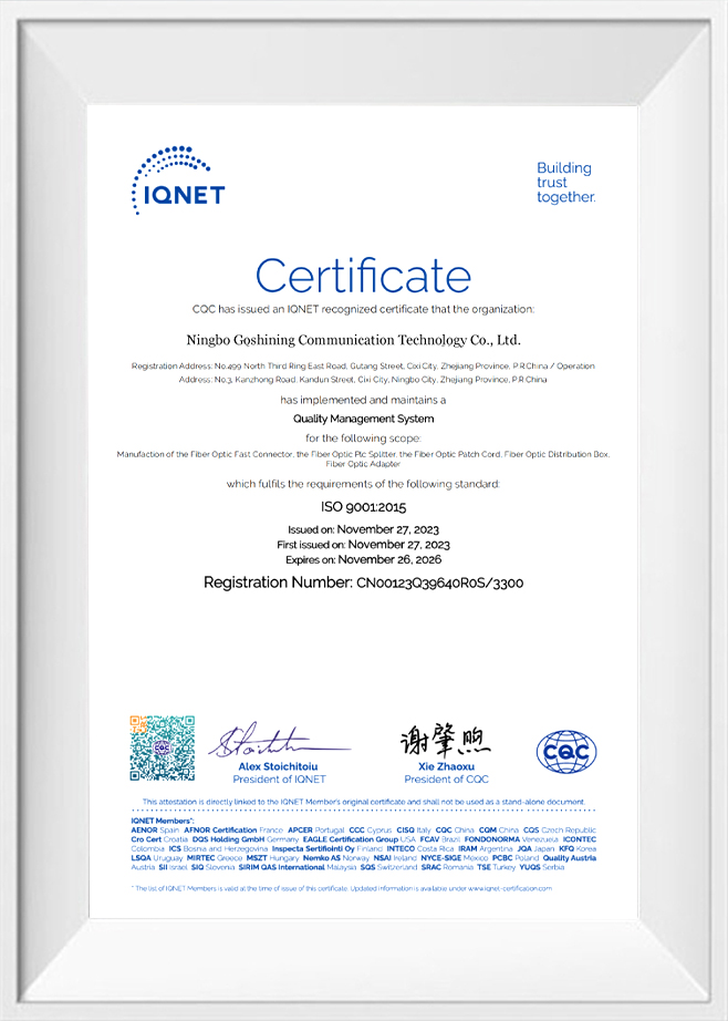 নিংবো গোশিনিং কমিউনিকেশন টেকনোলজি কোং, লি. একটি এন্টারপ্রাইজ যা উচ্চ-মানের এবং প্রথম-শ্রেণীর পরিষেবা সহ ফাইবার অপটিক পণ্যগুলির সম্পূর্ণ পরিসরের ডিজাইন, উত্পাদন এবং বিক্রি করে, যা আমাদের সমস্ত গ্রাহকদের চাহিদা মেটাতে এবং ওয়ান-স্টপ পরিষেবা অফার করতে সক্ষম করে। আমাদের পণ্যগুলির মধ্যে রয়েছে ফাইবার অপটিক ফাস্ট কানেক্টর, প্যাচ কর্ড, পিএলসি স্প্লিটার, কেবল, ডিস্ট্রিবিউশন বক্স, স্প্লাইস ক্লোজার এবং টার্মিনাল বক্স ইত্যাদি। আমরা আপনার নিজস্ব ব্র্যান্ড বিকাশে সহায়তা করার জন্য কাস্টমাইজেশন পরিষেবাও অফার করি।